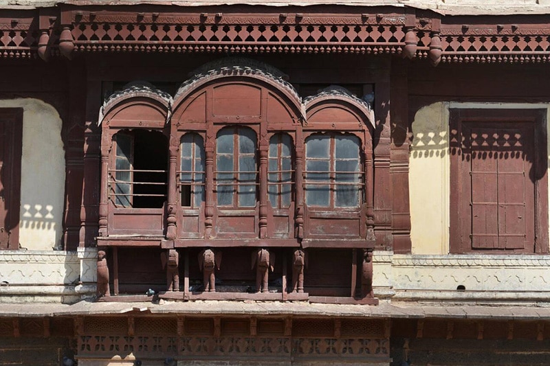 The main building of Rajwada Palace contains interconnected rooms, and what stands out are the intricate brass meshwork on the walls and ornate wooden jungle gates, which are essential elements of the palace’s architecture.