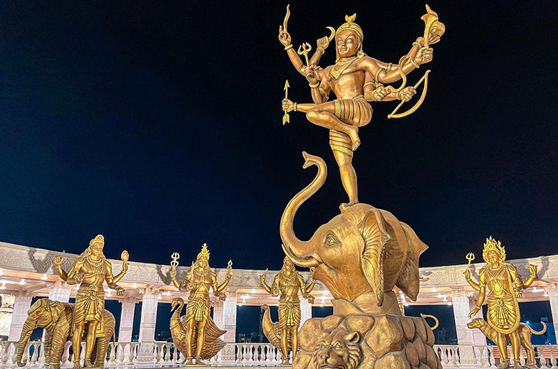 Within the temple premises, you’ll also find the resplendent statue of Panchmukhi Hanuman Ji, fashioned from seven sacred metals. The temple complex further houses the Navagraha Temple, the divine figures of Lord Krishna and Mother Yashoda, and a unique idol of Goddess Durga.
